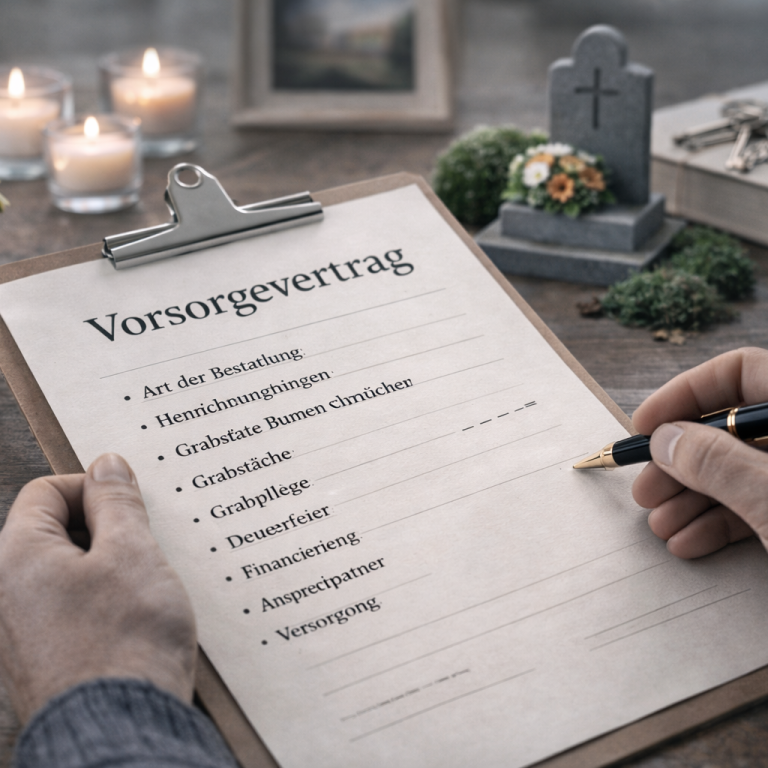 Wie soll Ihre Bestattung gestaltet werden? Mit einer frühzeitigen Vorsorge legen Sie Ihre persönlichen Wünsche verbindlich fest – von der Wahl des Friedhofs über die Gestaltung der Trauerfeier bis hin zu Grabstein und Grabpflege.