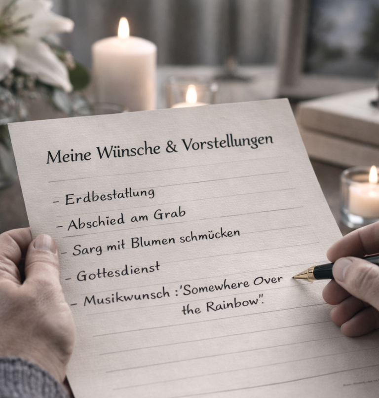 Es liegt an uns, für den Moment unseres eigenen Todes entsprechend vorzusorgen, um unsere Angehörigen zu entlasten und unsere Vorstellungen auch mit Sicherheit umzusetzen.